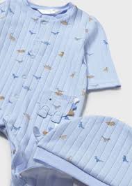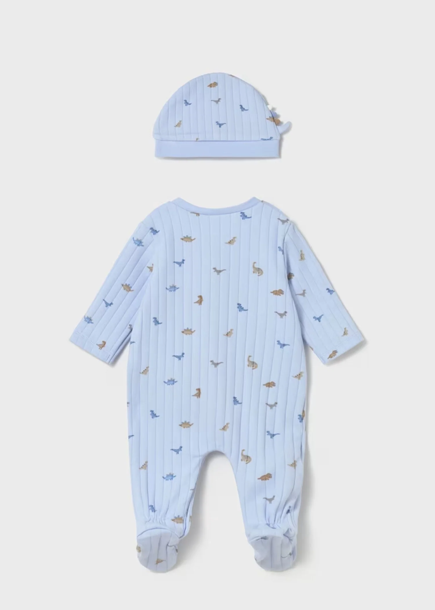 Pijama manga larga para recién nacido. Cierre con broches a presión. Diseño estampado de dinosaurios y bolsillo funcional en el centro. Incluye dulce gorro con aplique de cola de dinosaurio.