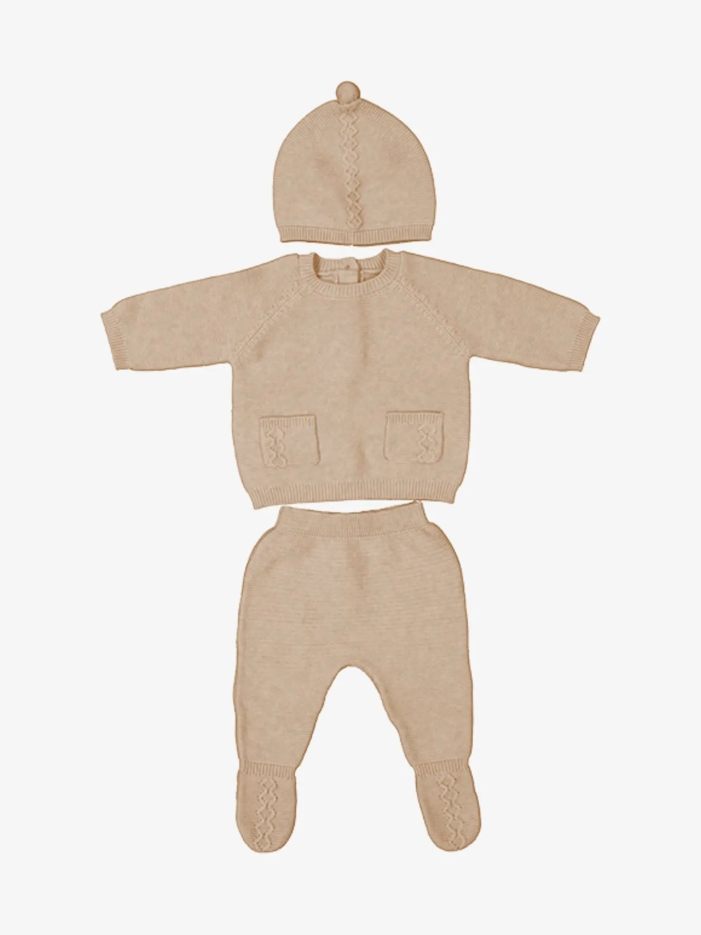 Original conjunto de tres piezas para recién nacido en suave punto tricotosa. Incluye jersey de manga ranglán con cierre posterior y bolsillos funcionales con delicados detalles trenzados, polaina con cinturilla elástica y acabados en canalé, y dulce gorro a juego con sutiles detalles en canalé. Un look completo, cómodo y elegante para los primeros días.