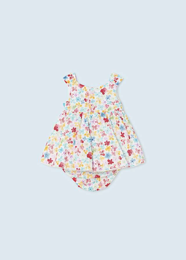 Conjunto de dos piezas para recién nacido formado por un vestido con braguitas a juego. Vestido sin mangas para recién nacido. Cierre con botones en la espalda para facilitar la puesta de la prenda. Tejido 100% algodón. Diseño estampado.